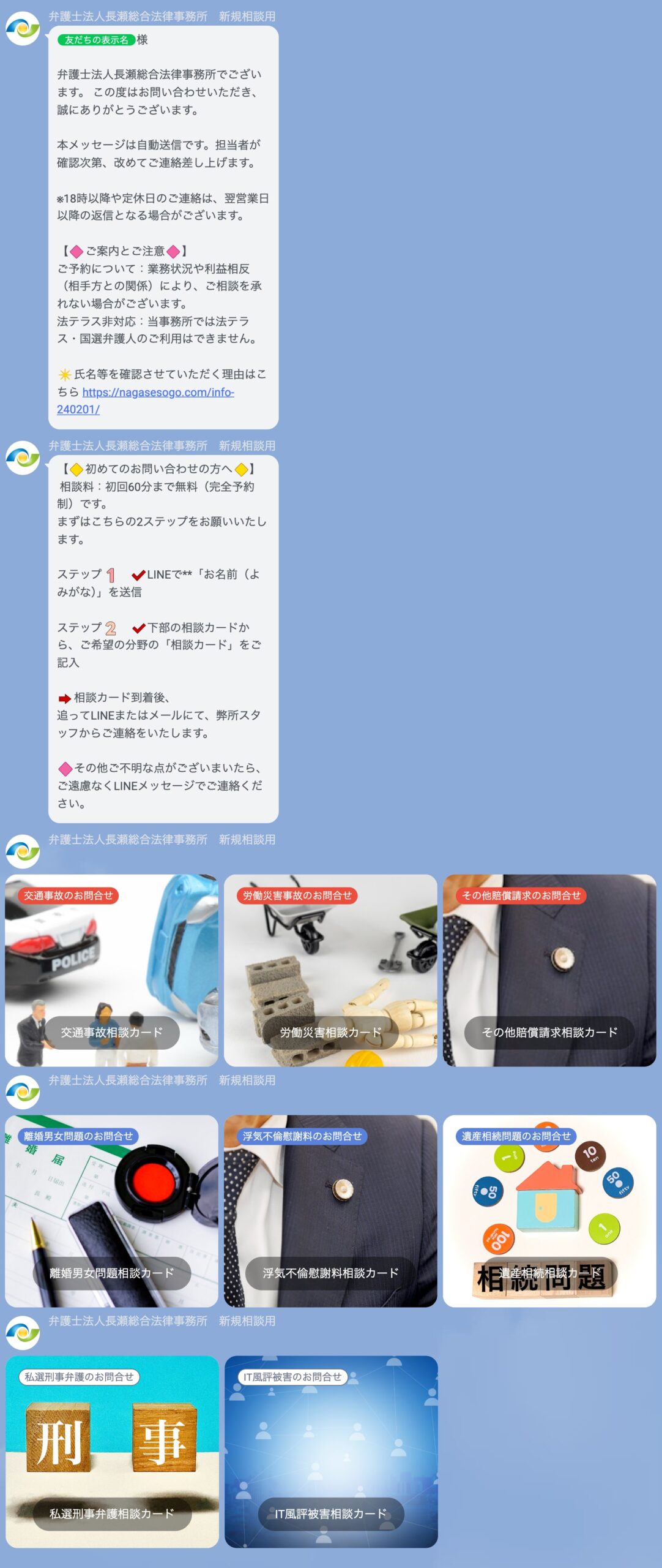 「友だち追加」を行ったあと、相談者(あなた)のお名前を送信いただくと、下の画像のような自動メッセージが弊所から届きます。その後は、メッセージの内容に従いお手続きを進めてください。